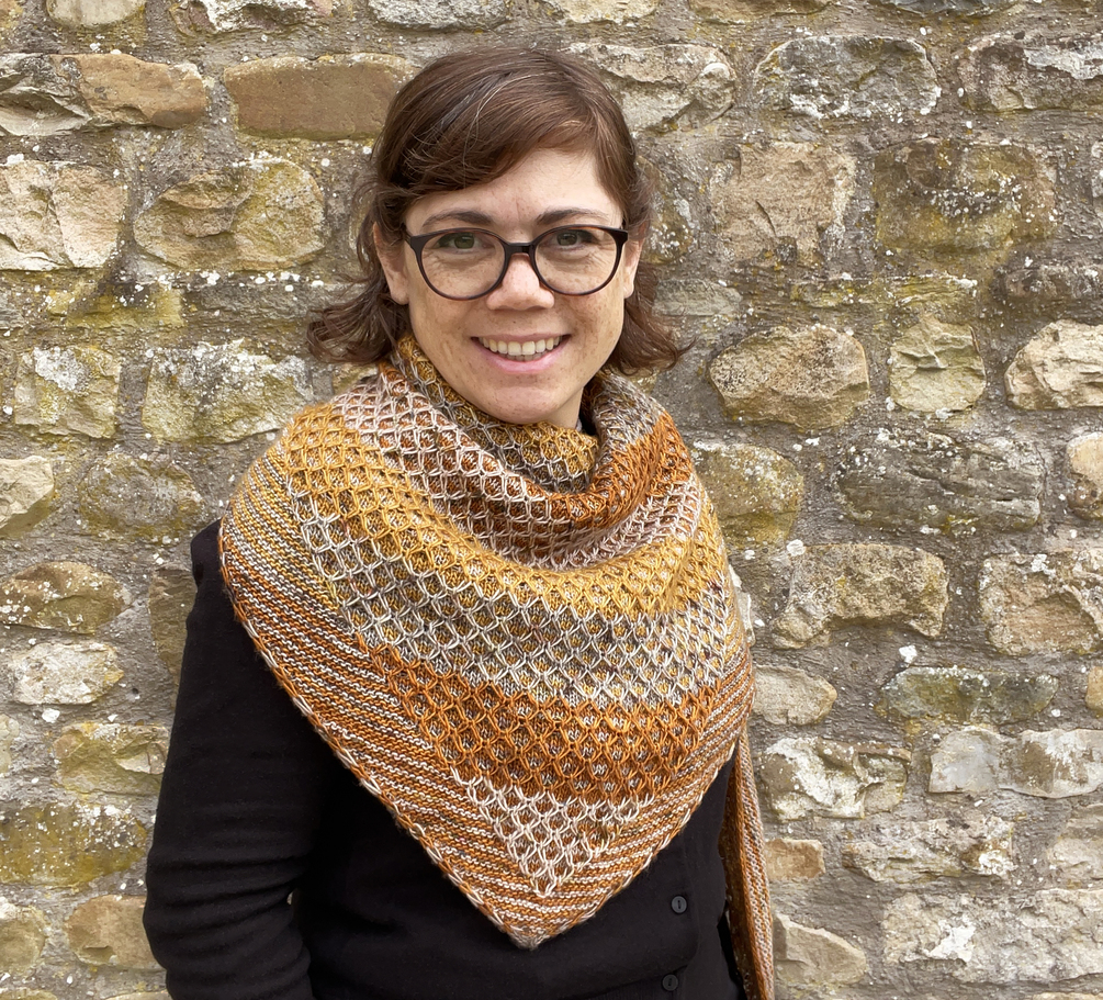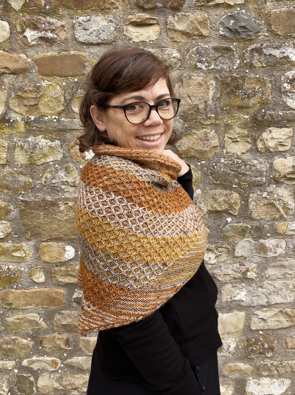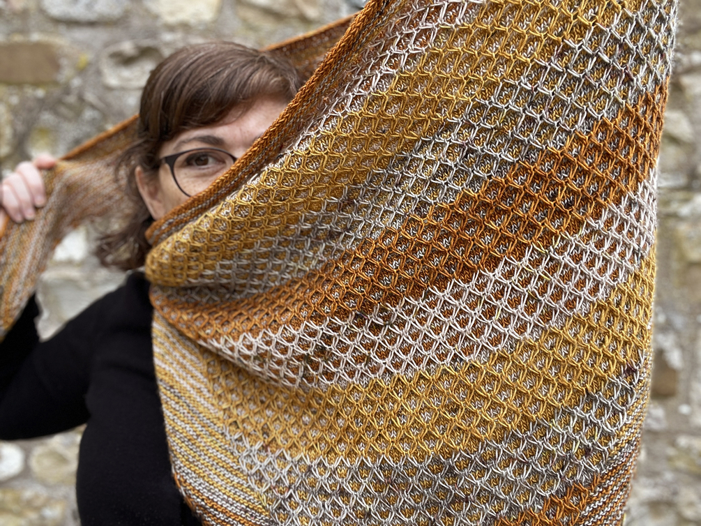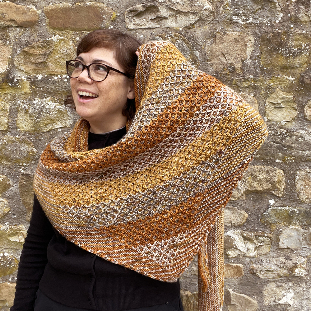 With magical skills you already possess, four colours of hand dyed singles can be whipped up into this texturific triangular shawl. Its crossover cable pattern is deeply cuddly and will bring you the kind of joy only a deeply satisfying hand knit can evoke. Your four colours undulate and alternate in wide, textured stripes flanked by blendy garter stitch. For best results, pick colors that aren’t extremely high contrast, like a fade or colors in the same color family. If you’re feeling adventurous, switch up the semi-solids for self-striping yarn and watch the colors change!